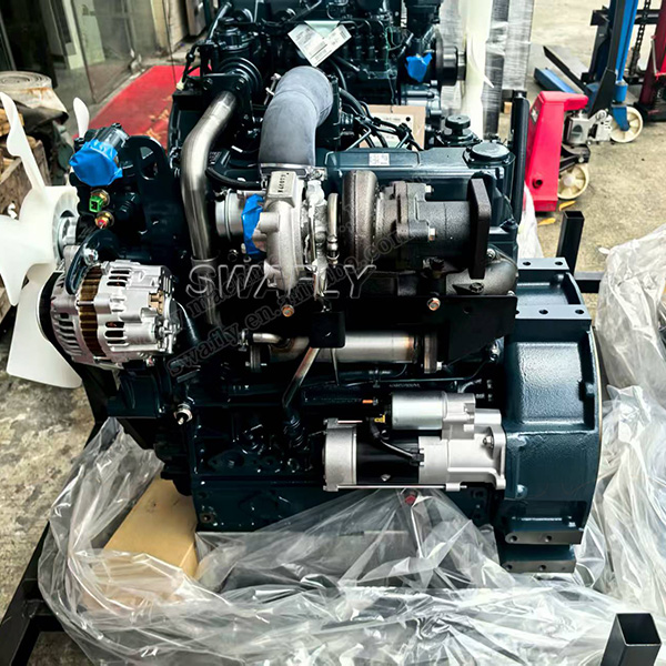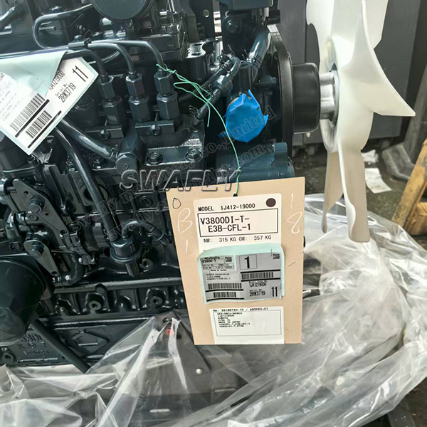 The Kubota V3800DI-T-E3B-CFL-1 engine assy 1J412-19000 Includes Block, camshaft, pistons and rings, turbo,starter, alternator, flywheel or bell housing,gaskets, water pump, valve cover, manifolds, injectors, oil filter, cylinder head, crankshaft, bearings, valve train, oil pump, oil pan, injection pump, fuel lines, and glow شاخه ها